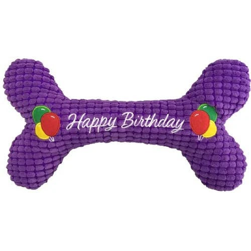 - 10" long bone-shaped dog toy made of purple plush with"Happy Birthday" and colorful balloons embroidered on for safe play.