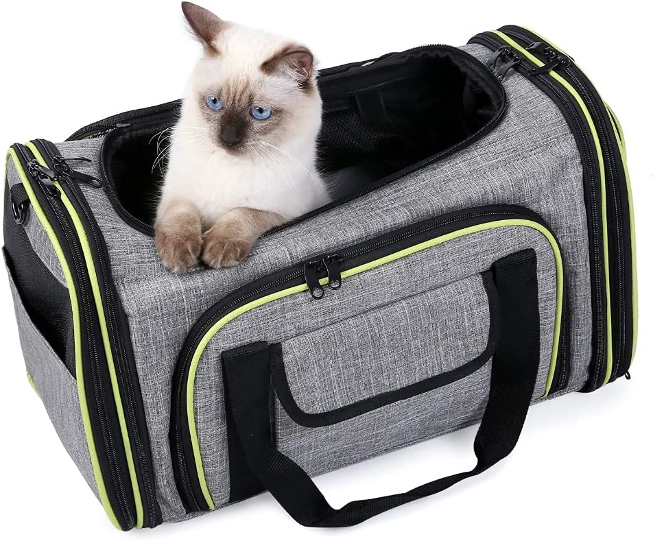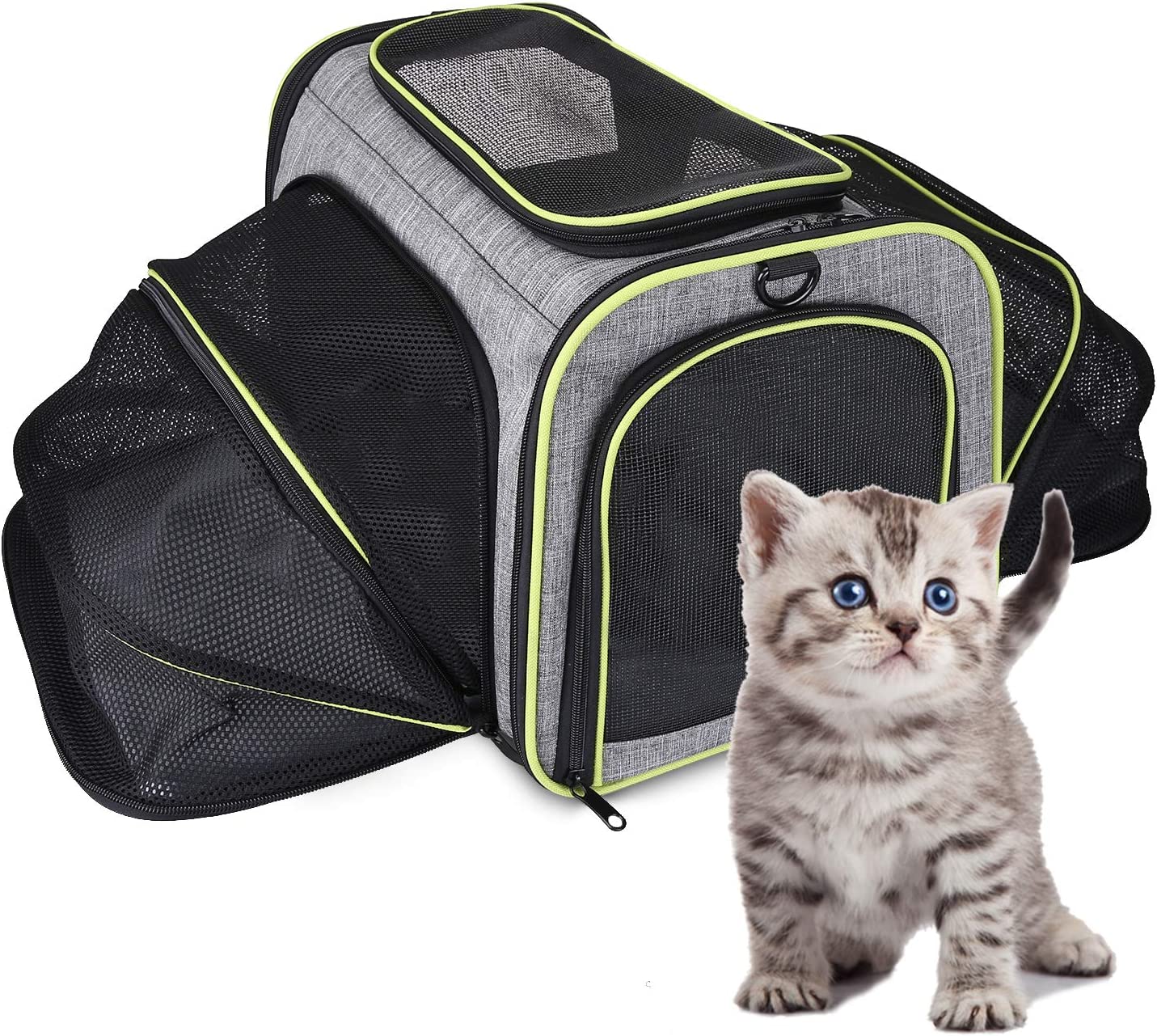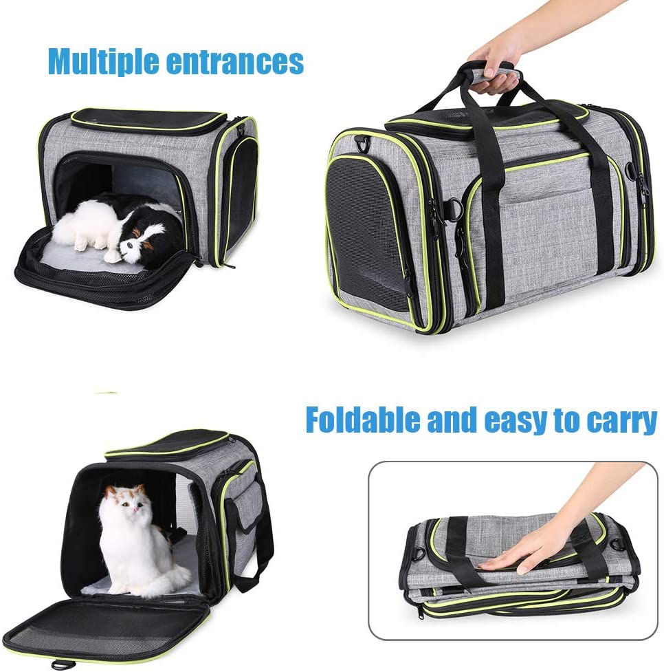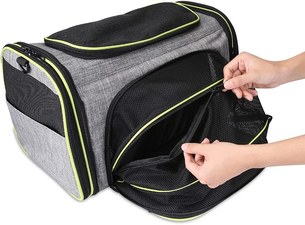 - Multifunctional Carrier: 2 front pockets + 1-side mesh pocket, will help you to organize small accessories, Pet food, pet toy, container of treats, snacks, calming collars, Pads, etc. 4-way expansions provide more room for your pets to move around. The mesh extensions give your cat or dog better vision and airflow.