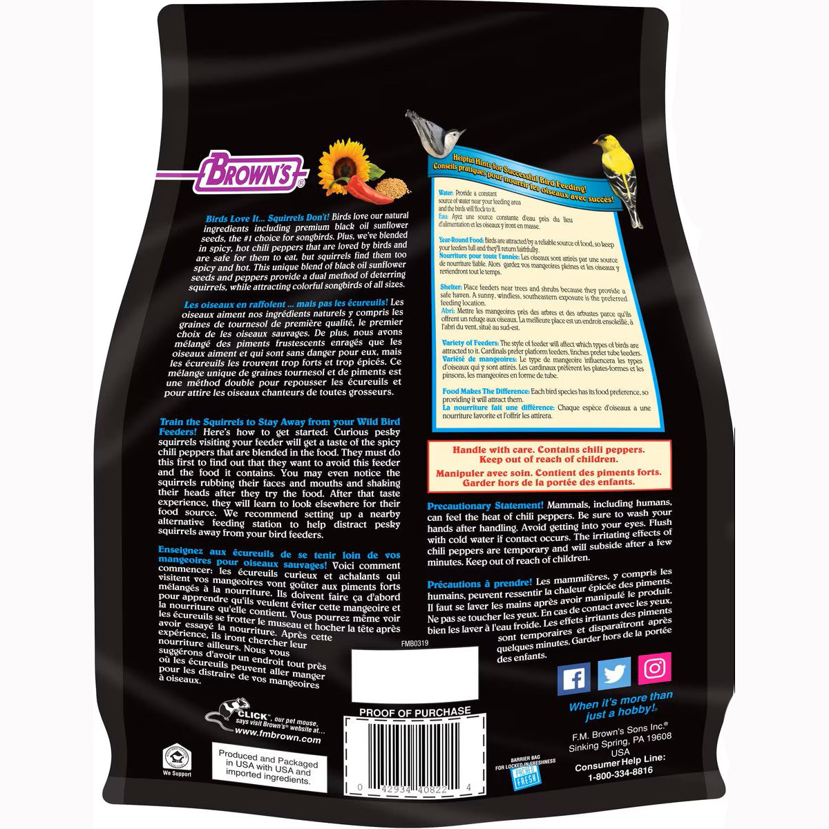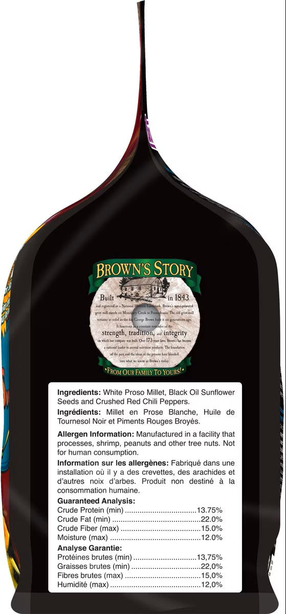 Brown’s® created Bird Lover’s Blend® for the experienced hobbyist and novice alike. This special blend is designed to attract the most desired birds in all regions during all seasons. We drew on the experience of six generations of the Brown’s® family to develop this product; we know it will bring the beauty of colorful songbirds to your backyard habitat and make the bird-feeding experience fun and rewarding for the whole family.