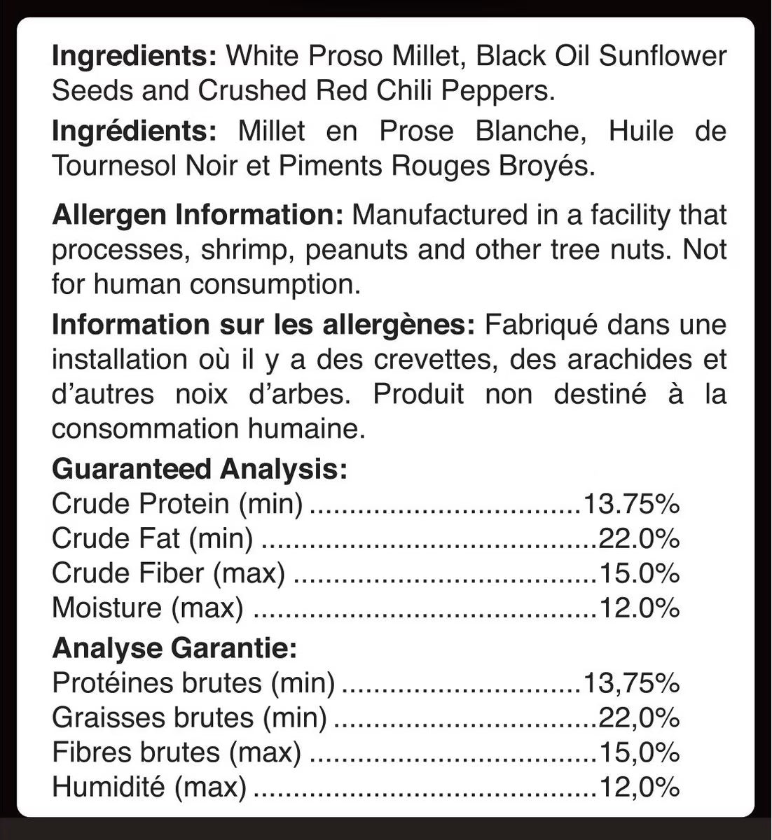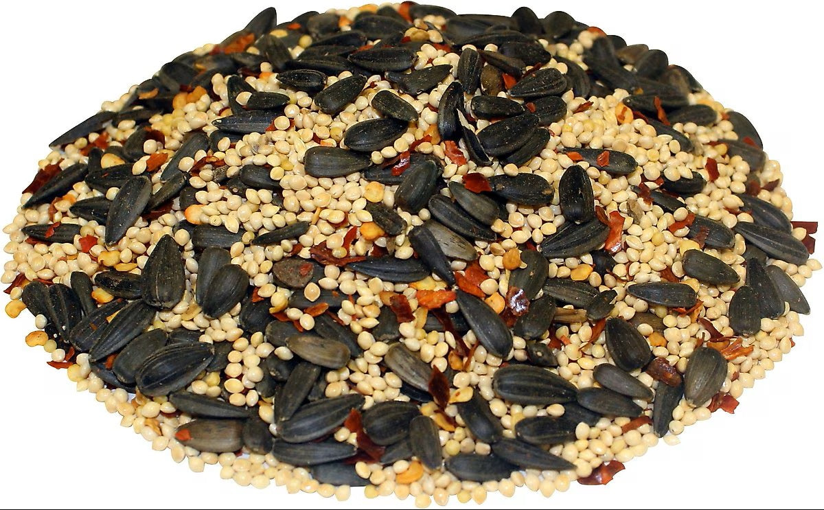 White Proso Millet, Black Oil Sunflower Seeds and Crushed Red Chili Peppers.