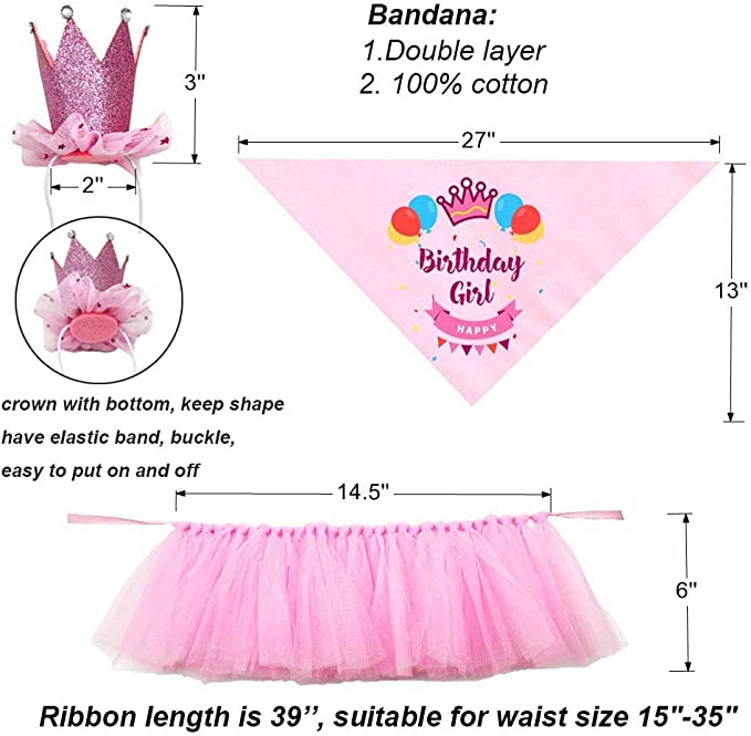 - Adjustable Size: tutu skirt with ribbon to tie, suitable for waist size 15''-35''; Bandana size L:27" x H:13", can roll up the scarf for small dogs; lovely crown is elastic with adjustable buckle. Pay attention to the size before purchasing.