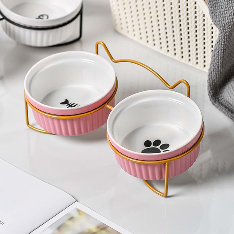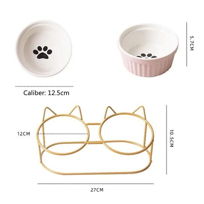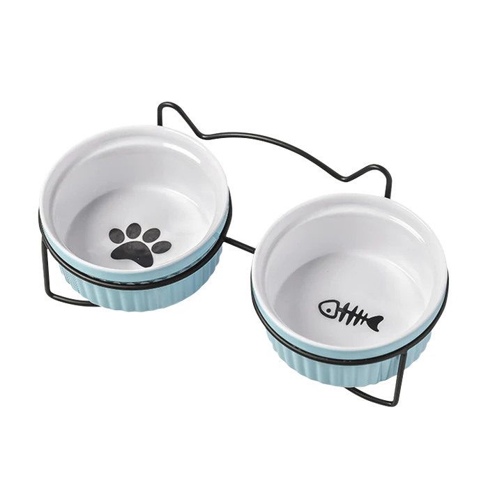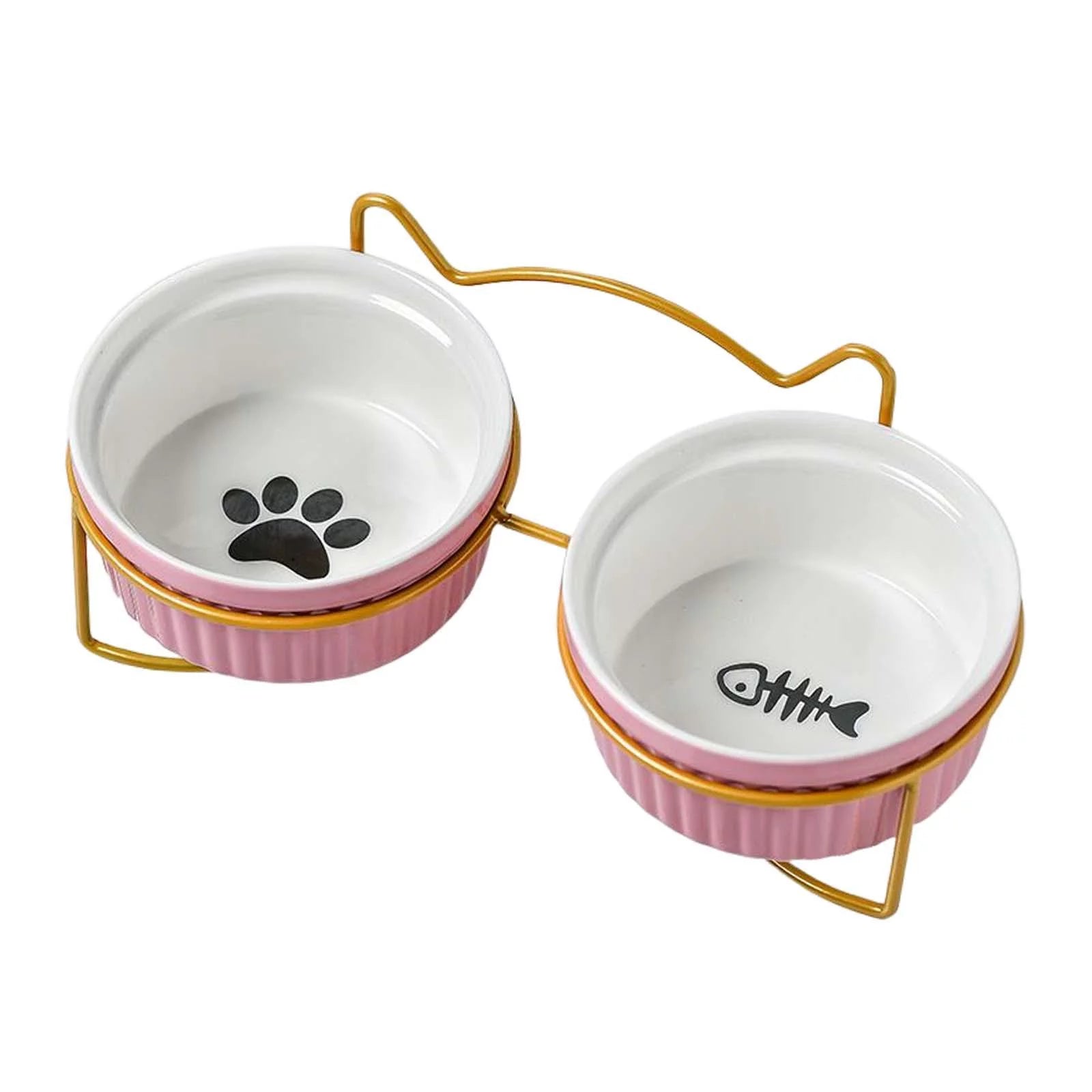 Elevated Metal Frame Ceramic Cat Double Bowls