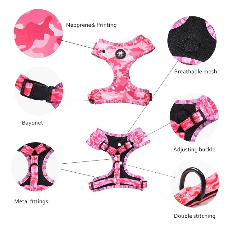 Designed for comfort and security, this harness features adjustable neck and chest straps for a tailored fit. Made with soft padded neoprene for durability, flexibility, and airflow, it keeps your pup comfortable while preventing restraint. Reinforced with a sturdy D-ring and lock buckle, it’s built for safe, worry-free walkies. Care: hand wash in cold water, air dry. -