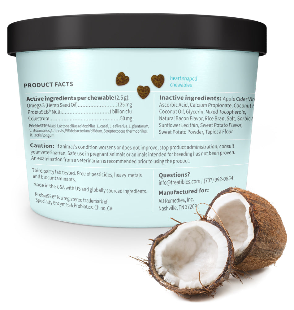 Probiotic Soft Chewables for Dogs are rich in omega-3 hemp seed oil and feature a proprietary blend of bacteria that keep unfriendly organisms at bay, helps maintain the natural balance of beneficial gut microflora and supports digestive tract health, the immune system and the body’s normal inflammatory response.