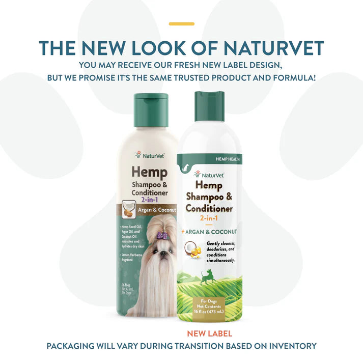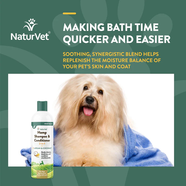 NaturVet® Hemp Shampoo & Conditioner 2-in-1 for Dogs gently cleanses, deodorizes, and conditions simultaneously to making bath time quicker and easier. Soothing, synergistic blend of Hemp Seed Oil, Argan Oil, Coconut Oil, and Aloe Vera helps to replenish the moisture balance of your pet’s skin and coat. Your pet’s coat will feel soft, hydrated, and healthy. Lemon Verbena provides a fresh, clean scent.