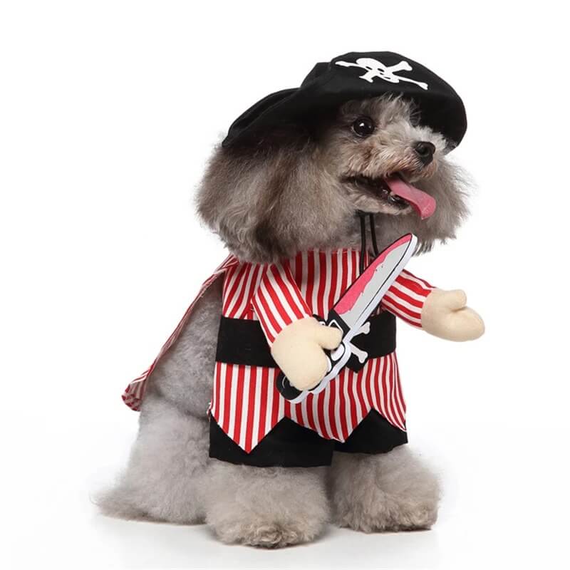 Whimsical Pirate Design: Watch as your pet embraces the pirate’s life, sporting a red and white stripe costume that includes a soft fabric knife and a black pirate hat. This costume adds a touch of humour and excitement to your Halloween celebrations.