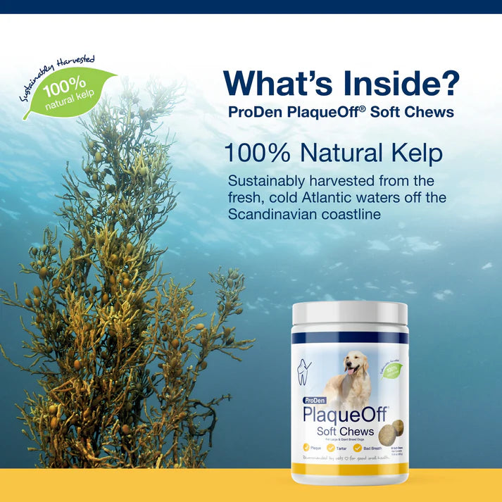 For use in large & giant breed dogs. Recommended to support healthy teeth, gums and breath odor. The ProDen PlaqueOff® key ingredient is 100% natural kelp and is sustainably harvested in the clear, cold waters off the Scandinavian coastline. Clinical trials on our kelp have shown to help reduce plaque and tartar while helping to improve bad breath.