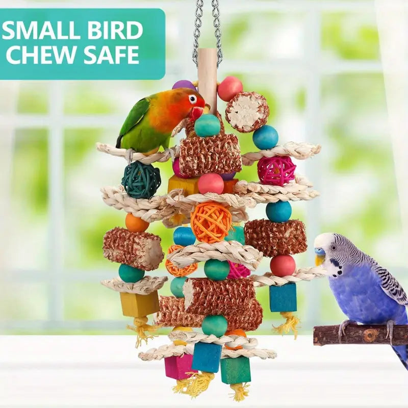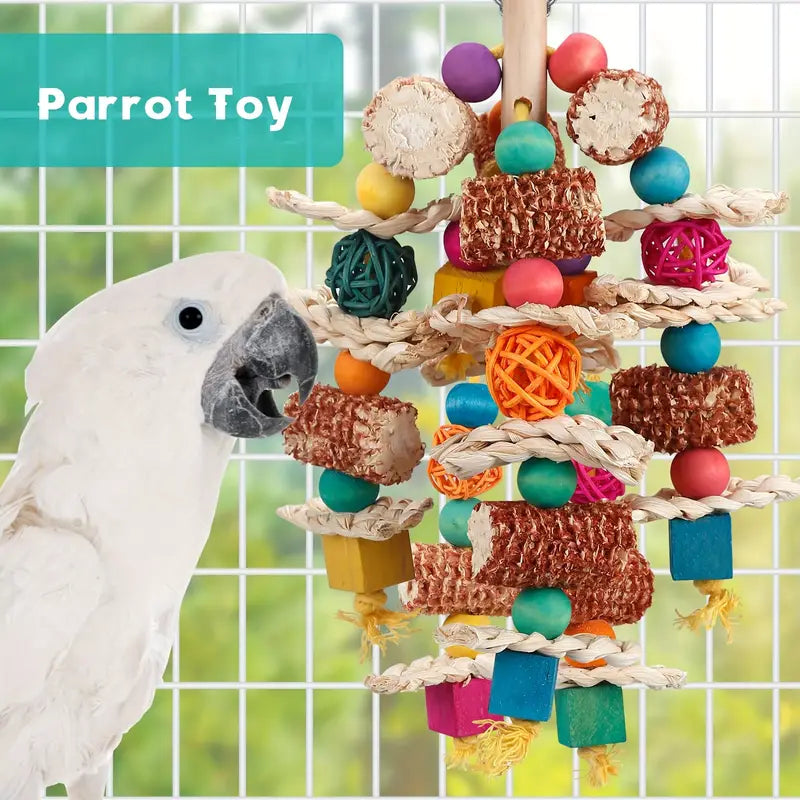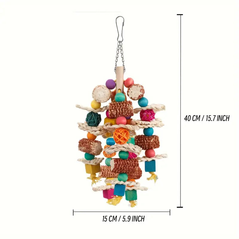 Natural Materials: Made from corn cob, corn husk, rattan balls, wooden blocks, and wooden beads, providing a safe and eco-friendly chewing experience for your feathered friends.