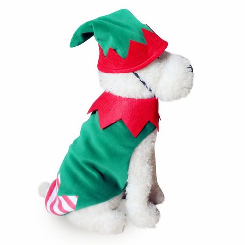 Don't forget about Man's best friend when you are making your holiday plans. Get your pooch the Elf Dog Costume. The two-piece outfit comes with an elf hat and a sleeveless dog shirt. The green hat has a pointy tip with an attached bell. The brim is made of red fabric with a zig zag cut. The green shirt stays secure by a strap on the tummy and has red and white stripes on the bottom. The red shirt collar matches the brim of the hat. Dress up your beloved pet when you take him for a walk on Christmas day or when you take your family photos.